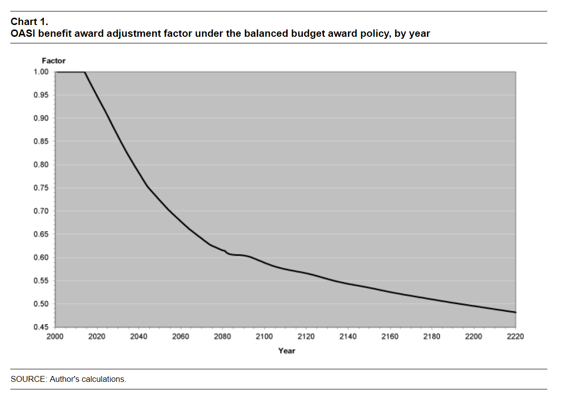 This is all very theoretical, but once we bring it back to the present day real world everything gets much worse. A pure PAYGO system doesn’t ever run at a deficit; it just pays out everything it brings in each year with nothing left over and nothing owed. The current Social Security system now faces an ongoing deficit because fundamentally, current law is written to promise higher-than-g returns to retirees, something that is ultimately unsustainable. How much would law have to change to restore long-run financial viability to the system? One of the most comprehensive treatments on this topic is this 2007 report by Dean Leimer working for the Social Security Administration Office of Policy. Using data current at the time (don’t worry, the numbers have only gotten worse since then), he plots the path benefits would have to decline by as a proportion of present law if we began cutting them in 2015. Here’s what that looks like: