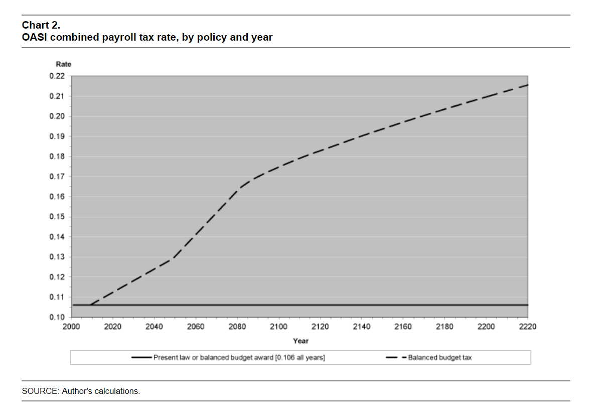 This is, as Leimer notes, “rather dramatic.” Even if we get started three years ago, Social Security benefits would have be cut by 25% by the early 2040s to remain on a sustainable path, and would continue to fall for generations to come. Such draconian action is probably politically unacceptable, and polls show more Americans favor raising taxes instead of cutting benefits in order to support Social Security, so at least in the short-to-intermediate-term that’s probably what we’ll get. What will that look like? Leimer has a chart for that too.