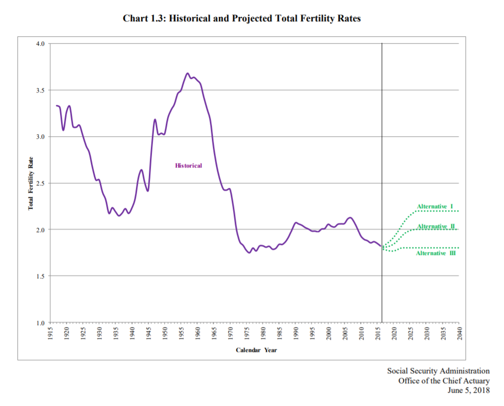 The SSA does a lot of work to model what they think r and g will be in the future. g is a combination of productivity growth and demographics (population growth), the latter of which relies principally on the fertility rate. Fertility rates around the world have of course been falling for a while now, in some cases for hundreds of years. As of the latest (2018) report, the SSA now assumes for its baseline projections that US fertility will stabilize at 2, which maintains a constant population. In their more pessimistic “high cost” scenario (Alternative III) they assume it will stabilize at 1.8, which would eventually result in a slowly declining population.
