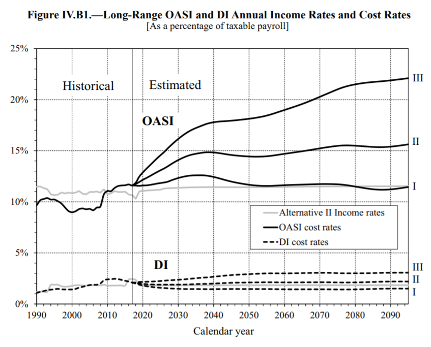 Hahaha no of course the news isn’t as good as that. First of all, from the perspective of a Social Security participant, being “invested” in the program is actually much riskier than investing in treasury bonds. Your future benefits in fact depend on the path of average earnings in the economy, and this is a variable that is subject to the same sort of macroeconomic risks as the stock market. John Geanokoplos actually has another paper on this topic and concludes that the SSA should be using a much higher rate to discount its liabilities than the “risk-free” rate it currently prefers.