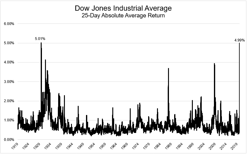 A 20% loss in one quarter is bad enough, but the violence with which the sell-off occurred was truly historic. On Thursday, March 12th the S&P 500 closed down 9.49%, the worst day since Black Monday, 1987, and the 5th worst day on record. The next day it went up 9.32%, one of the best days ever. The following Monday it was down again even worse, 11.98%, the third worst day in history, just shy of the first day of the stock market crash in 1929. These wild swings go beyond even what we saw in the financial crisis a decade ago and hearken back to the Great Depression. Here’s one way of visualizing the COVID-19 bear market volatility, looking at average daily moves over 25-day windows: