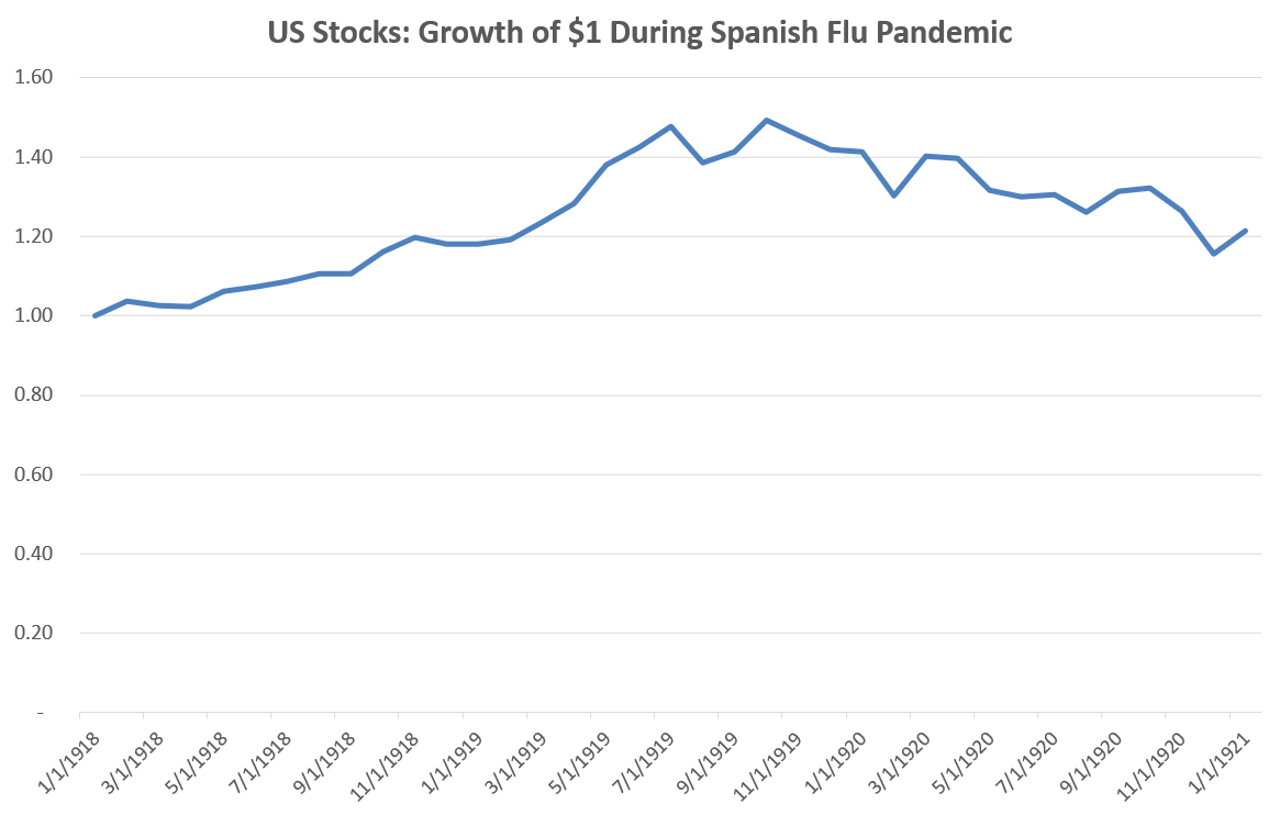 US stocks were up by 20% during the Spanish Flu Source: Robert Shiller’s Online DataThey were up! Stocks were actually up during the Spanish Flu pandemic, by about 6.7% annualized over the three year period of the outbreak. Granted they were down a bit for the latter half of the period, but once 1921 rolled around and the flu subsided we of course began the roaring ’20s, one of the truly great bull markets of all time.